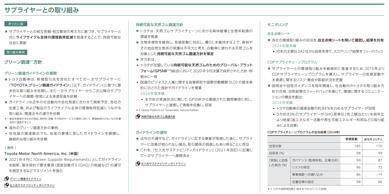 - トヨタ自動車は、サプライヤーに対して具体的なGHG排出量削減を求め、CDPを通じた回答要請も実施しています。