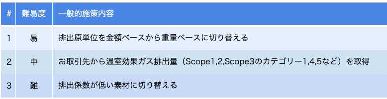 カテゴリ1には、原材料の調達、パッケージングの外部委託、消耗品の調達などが含まれます。カテゴリ1の一般的な削減施策は「排出原単位の切り替え」「お取引先からの温室効果ガス取得」「排出係数の低い素材への変更」がメインとなります。難易度順に並べると以下のようになります。排出原単位の金額ベースから重量ベースへの切り替えが一番取り組みやすいため、まずはそちらから取り組むことをおすすめします。