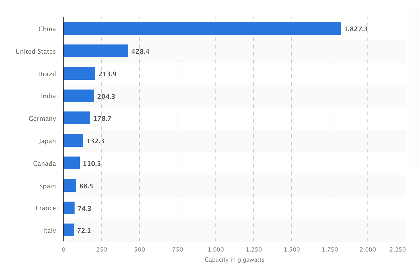 世界の再生可能エネルギー設備容量ランキングは以下の通りです。
