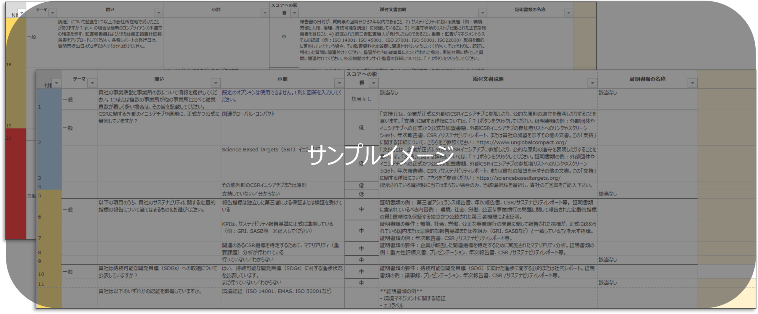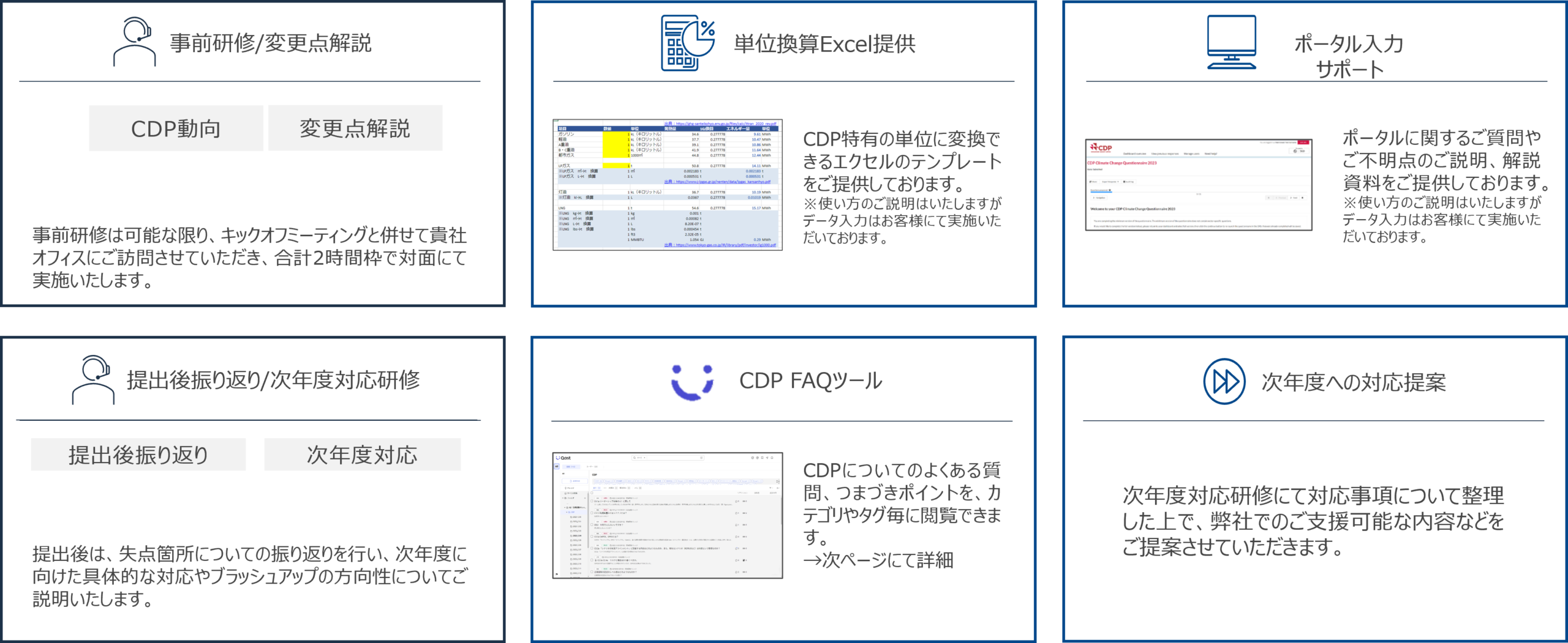 EcoVadisやCDPでの回答は初年度行う際には言葉や単語が難解であり自社のみで対応することが難しいことが多いです。顧客から求められている水準を把握したうえで必要最低限の支援を提案します。