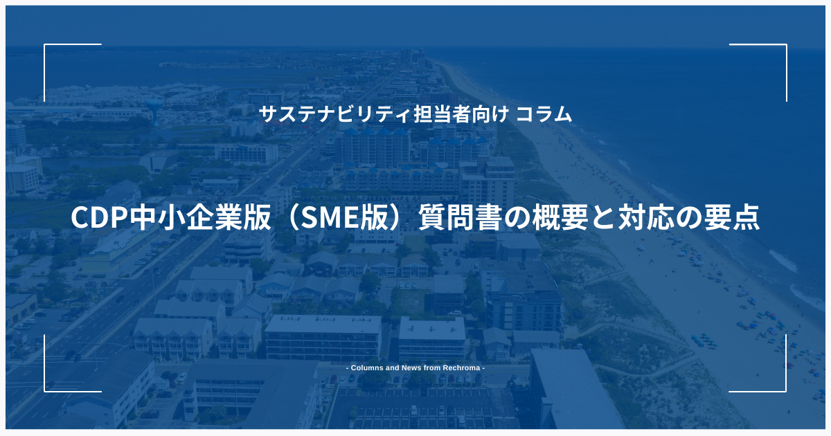 - CDP中小企業版(SME版)質問書の概要と対応の要点【気候変動関連用語がまるわかり!用語集はこちら】 CDPの質問書には、企業の規模や特性に応じて「完全版」と「SME版(中小企業版)」の2種類が存在します。本稿では、初めて回答を検討する、あるいは要請を受けた中小企業の担当 […]