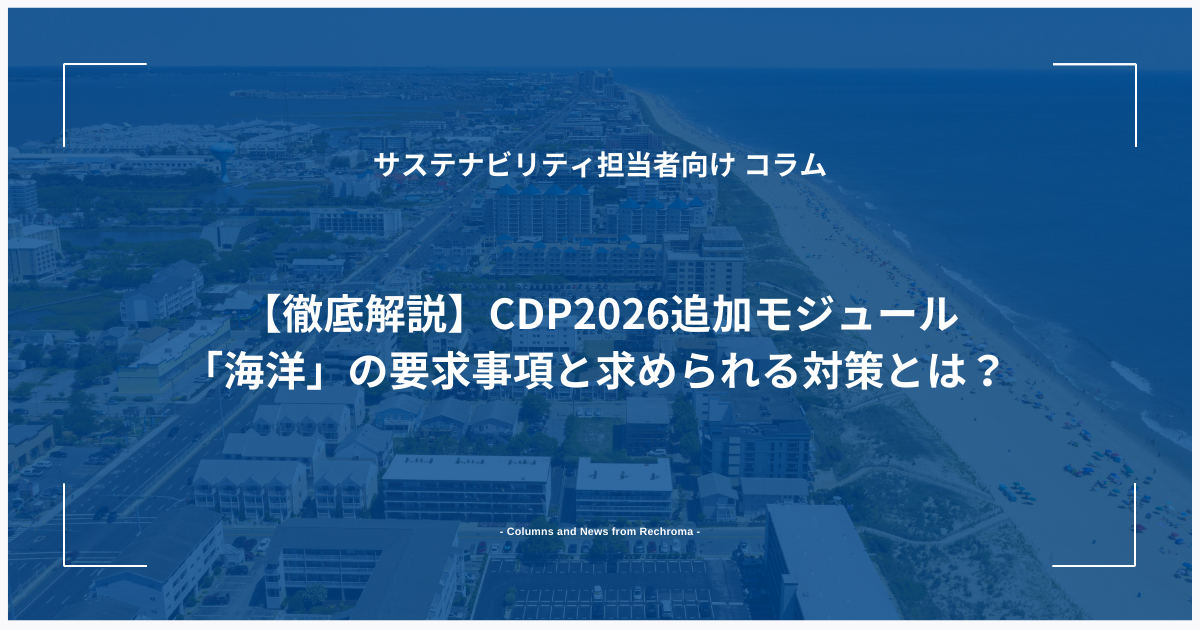 - 【徹底解説】CDP2026追加モジュール「海洋」の要求事項と求められる対策とは? 【気候変動関連用語がまるわかり!用語集はこちら】 はじめに:気候変動から「自然資本」へ 2025年、世界最大の環境情報開示プラットフォームであるCDPは、2026年の質問書に「海洋(Ocean)」モジュールを […]
